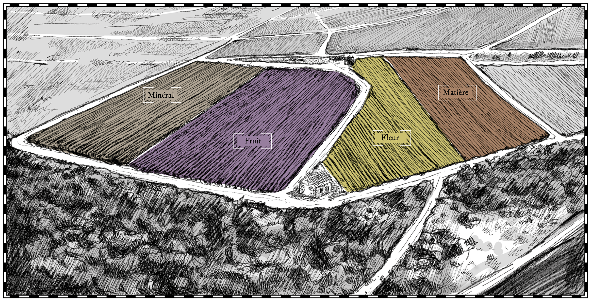 After several years of winemaking, it became apparent that the Largillier monopoly produced four distinct wine profiles. These come from four clearly identified sub-plots, which I have chosen to name according to their taste expression: Mineral, Fruit, Flower and Matter.